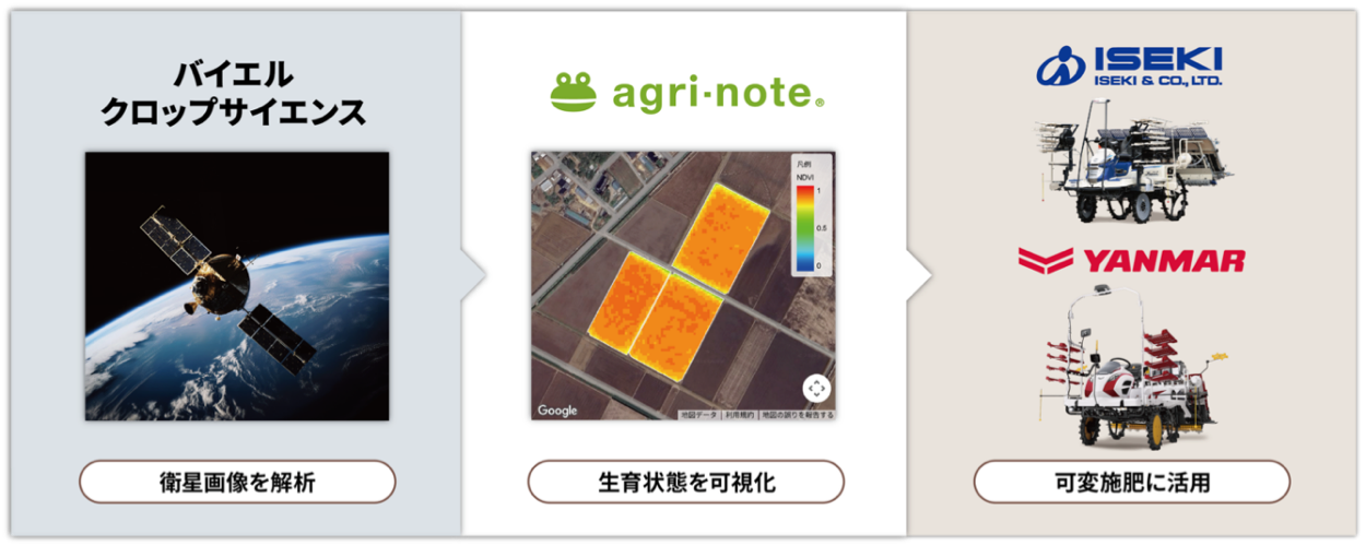 新潟、愛媛、岡山、東京、2026年3月5日 ― バイエル クロップサイエンス株式会社(東京都千代田区、代表取締役社長:大島 美紀、以下バイエル クロップサイエンス)と、ウォーターセル株式会社(新潟県新潟市、代表取締役社長:渡辺 拓也、以下ウォーターセル)、井関農機株式会社(愛媛県松山市、代表取締役社長:冨安 司郎、以下井関農機)、ヤンマーアグリ株式会社(岡山県岡山市、代表取締役社長:所司 ケマル、以下ヤンマーアグリ)は、4社の技術と知見を活用し、衛星データを基に圃場の生育状況を可視化し、適期作業の実現から可変施肥による肥料の効率的な使用までを支援する機能を共同開発しました。本成果を活用し、ウォーターセルは「アグリノート 衛星リモートセンシングサービス」のお試し版を2026年3月5日より提供開始します。